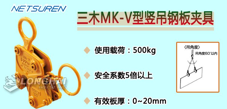 ● 三木MK-V型豎吊鋼板夾具,采用手動鎖安全裝置,整機(jī)安全系數(shù)5倍以上;