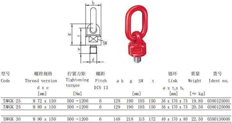 TAWGK型可旋轉(zhuǎn)吊點(diǎn)是德國JDT系列吊裝索具,德國JDT品牌原裝進(jìn)口,為螺旋式可旋轉(zhuǎn)吊點(diǎn),吊環(huán)上均印有JDT標(biāo)識(shí)及工作載荷限值。