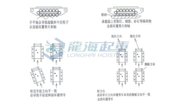 3. 在多臺組合使用時,務必使每臺CRM履帶式搬運小坦克的運行方向完全調節一致,需要保持前后車組的側板在同一直線上,務必全部側板方向平行一致。